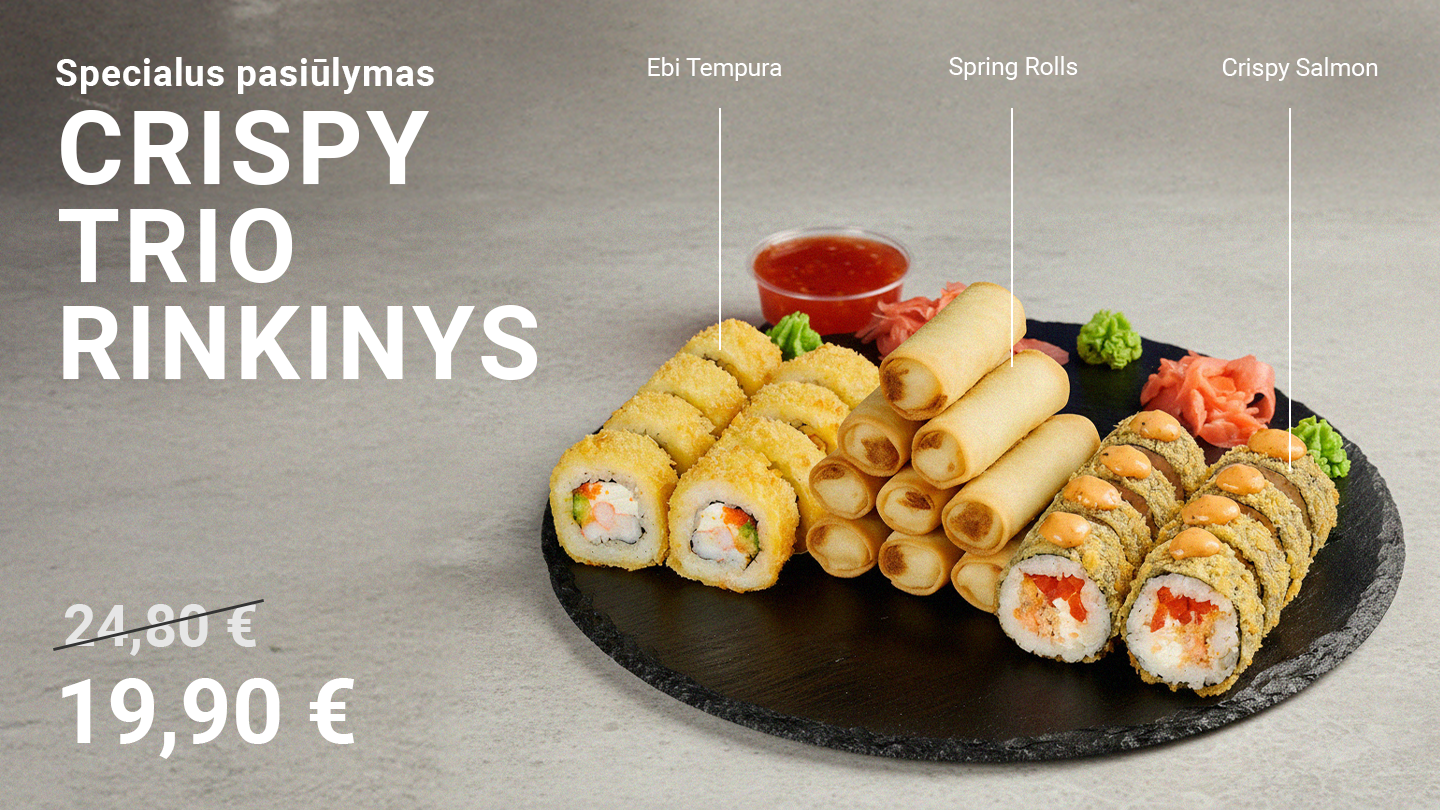 Ebi Tempura( 8vnt.), Crispy Salmon (8 vnt.), Spring Rolls (8 vnt.).